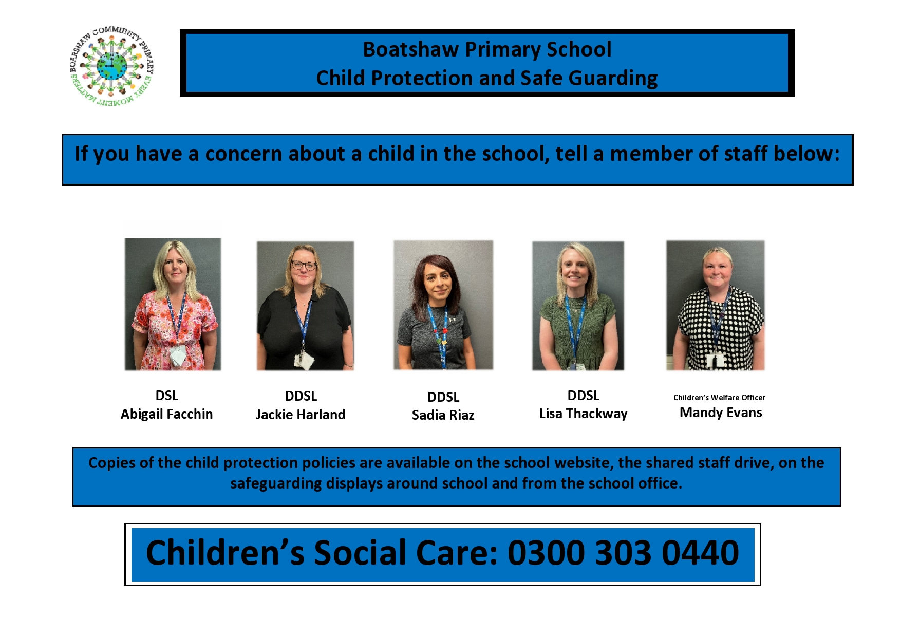 Deputy DSL’s in school are Jackie Harland, Sadia Riaz, Lisa Thackway. If a child is worried about something and needs an adult to talk to, these are the people to go to. However all staff at Boarshaw Primary have had the appropriate level of safeguarding training and a pupil can speak to whoever they feel comfortable talking to.